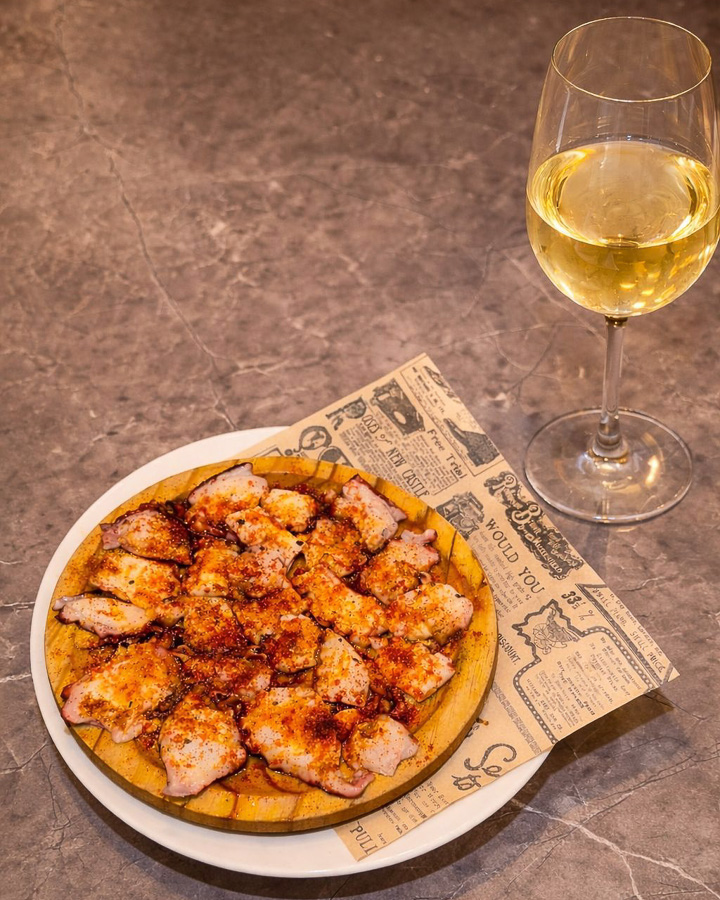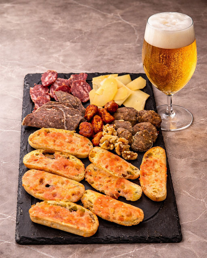 Tapas y raciones, incluyendo típicas tapas menorquinas caseras como calamares, albóndigas, croquetas, embutidos locales y más.