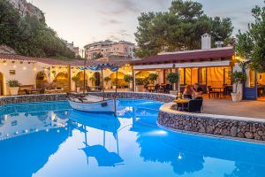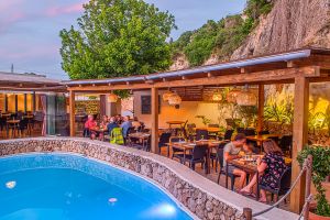El Restaurante Can Avelino 23 en Menorca es un lugar con encanto, fruto de una magnífica reforma de la que han sabido sacar el máximo partido. En su patio destaca una piscina o lago central con un llaüt menorquín flotando, que aporta un aire auténticamente mediterráneo y muy especial. Las paredes forman recovecos naturales, habilitados como rincones íntimos para tomar una copa, mientras en las rocas se proyectan imágenes que crean un ambiente único en la isla.